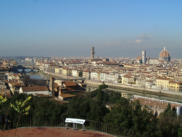 | フィレンツェは、ルネッサンスが開花したことでその名を世界に知られている。また2001年に竹之内豊とケリー・チャンの主演で映画化もされた小説「冷静と情熱のあいだ」ではその物語の舞台となった街でもある。 ベネチアからフィレンツェへは、旅行会社が手配したバスで移動した。霧がひどく、景色があまり見えなかったので、ぐっすり眠っていた。途中ドライブインでトイレ休憩を取ったが、それ以外は走りっぱなしである。お昼頃フィレンツェへ到着した。 フィレンツェ1日目 ミケランジェロ広場 まずは、フィレンツェの市街からアルノ川をはさんで対岸のあるミケランジェロ広場へ。 ここは、フィレンツェの街並みを一望できるポイントである。天気も良く、美しい街並みを見ることができた。