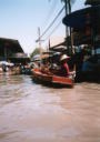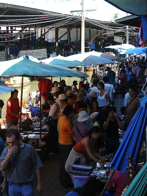 | 市内観光2日目 ダムノン・サドゥアク水上マーケット 市内観光2日目では、市内観光といいつつバンコク市内を出て郊外の観光地へ行く。まずは、水上マーケットの風情を楽しむことが出来るダムノン・サドゥアク水上マーケットだ。 マーケットからは少し離れた場所にある駐車場で車を降り、ボートに乗る。日差しは強いが、ボートには屋根がついているし、結構スピードを出すので風も心地よい。 マーケットが近づくと船の密度も上昇し、賑わいも出てくる。ちょっとした日用品や観光客目当ての商品のほか、簡単な食事まで小船で売っている。市場というのは庶民のパワーを肌で感じることが出来る場所だなと、つくづく感じさせられる。