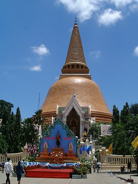 朝も早かった上、お昼に近く、本来ならおなかが減ってもおかしくないところだ。しかし、水上マーケットで買い食いをしているのでまだまだ大丈夫だ。 ナコン・パトム 水上マーケットから、ローズガーデンに向かう途中、ナコン・パトムに寄る。ナコン・パトムは7 〜11世紀に栄えたドヴァーラーヴァティー王国の首都だった場所。ナコンの街は観光地というより学生の街というほうが良いところで、この日は観光客でごった返すこともないので、ゆっくりお寺を見ることができた。 ナコン・パトムといえば、やはり高さ120mの世界最大の仏塔が見ものである。